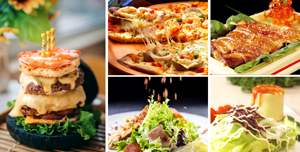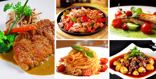 中西融合菜:蒜香柠檬烤鱼、龙利鱼配红椒汁、海苔猪扒卷、鲜菌培根意粉、芝士海鲜焗意粉、红葱头菲力牛排、香草蛋黄酱焗鲍鱼等。