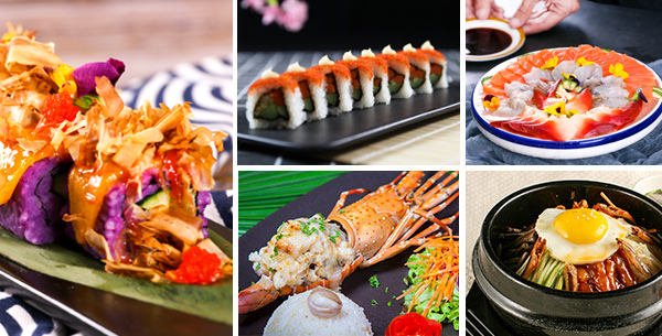 日式料理:花式寿司卷、刺身拼盘、日式照烧汁煎扇贝、照烧汁煎鲷鱼、日式海鲜炒乌冬面、日式鲑鱼茶渍泡饭等;