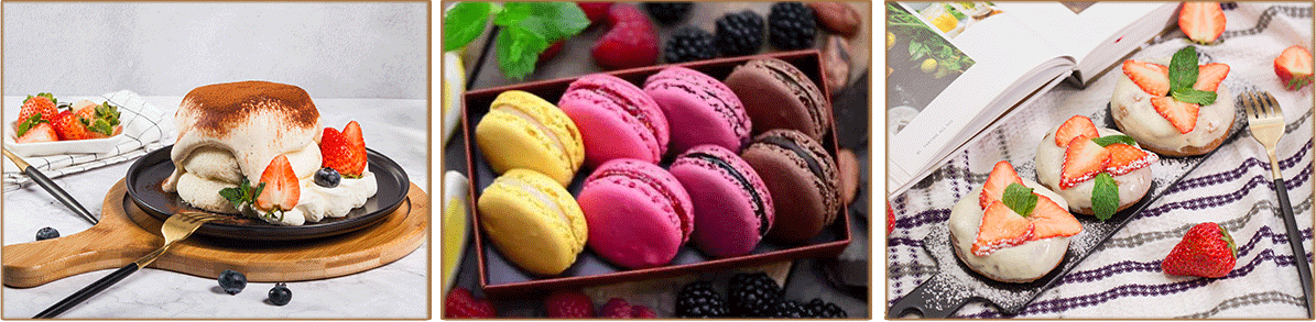 法式烤布蕾、泡芙、拿破仑蛋糕、马卡龙、慕斯蛋糕、各色水果蛋挞等